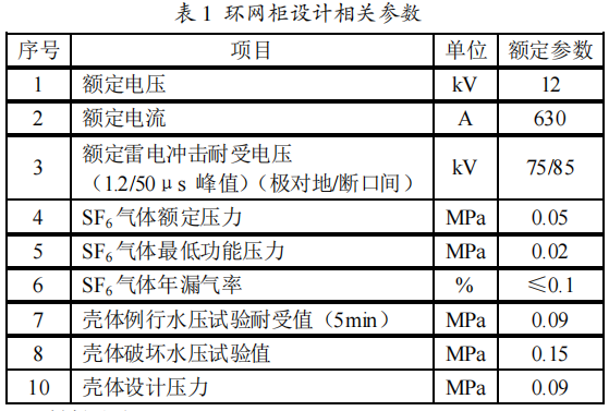 環(huán)網(wǎng)柜殼體形狀不同有箱式和筒式之分。由于箱式結(jié)構(gòu)有利于實現(xiàn)進出線.配電方案的實施,但是箱式在承受壓力的局限性,使箱體不能夠承受太高的壓力。下面介紹一種環(huán)網(wǎng)柜氣箱的設(shè)計方法。與氣箱設(shè)計有關(guān)的環(huán)網(wǎng)柜額定參數(shù)見表1。
