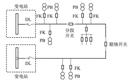 如下圖所示,其作為現階段典型的配電體系拓撲圖,變電站的10kV出線裝備斷路器和對應維護,主線路中引證開關分段,各分支線路結合負荷開關的方法進行裝備,且全部開關都具有合閘等功能。由于分段開關與負荷開關在運轉期間,難以斷開短路電流,所以不需求安裝維護設施。其間,圖中的DL歸于斷路器,FK歸于負荷開關,而PB是配變。