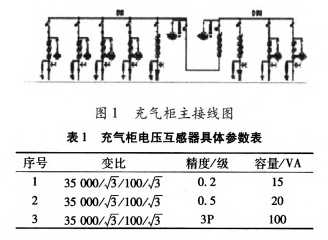 變電站位于高原地區,海拔2100m。變電站選用某公司生產的35kV中壓充氣柜。主接線如圖1所示,其間電壓互感器型號為JDZx-35(A、B、C)型,詳細參數如表1。