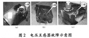 2012年3月26日,檢修人員連夜對35kV垣潔線56號線路電壓互感器進行拆除檢查,發現電壓互感器A、B、C相損壞,A、B相有炸裂現象;B相PT損害嚴峻,側壁脫離本體,插頭掉落,繞組徹底毀損;A相PT插頭掉落,表面漆層及噴鋁層受損;C相表面漆層及噴鋁層受損,其它部位正常,如圖2所示。