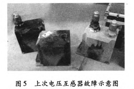 2011年3月30日0:38,35kV垣潔線、35kV垣宏回A、B相電壓互感器擊穿,如圖5所示;2012年3月26日19:7:58,35kV垣潔線56號線路電壓互感器A、B、C相損壞,A、B相有炸裂現象。