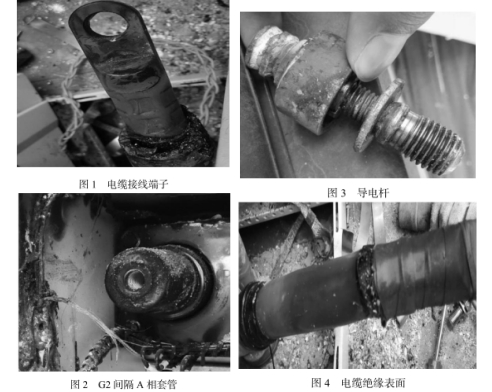 搶修人員對G2間隔電纜撤消后,發(fā)現(xiàn)電纜接線端子(如圖1所示)氧化嚴(yán)峻,說明此處遭受過高溫腐蝕,而且應(yīng)力錐接近端子處的燒蝕痕跡也說明晰插頭受高溫腐蝕;現(xiàn)場發(fā)現(xiàn)端子與環(huán)氧套管銅件的接觸面存在明顯氧化,說明高溫腐蝕時,端子與環(huán)氧套管銅件表面并未完全嚴(yán)密貼合;檢查套管內(nèi)部螺紋亮光正常(如圖2所示),說明導(dǎo)電桿設(shè)備緊固。環(huán)氧套管遭受高溫痕跡明顯,且銅件表面與端子接觸面也有很明顯氧化痕跡,說明在高溫產(chǎn)生時,端子與環(huán)氧套管銅件表面并未完全嚴(yán)密貼合;現(xiàn)場對導(dǎo)電桿(如圖3所示)進(jìn)行檢查,發(fā)現(xiàn)變徑螺桿氧化,以及銅嵌件脫離環(huán)氧,熔融附于變徑螺桿上,都說明此處飽嘗過高溫傳導(dǎo);對電纜應(yīng)力錐剝除后,發(fā)現(xiàn)電纜絕緣表面(如圖4所示)無明顯爬電痕跡,說明應(yīng)力體部位未產(chǎn)生爬電缺點,從絕緣受高溫腐蝕和燒蝕判斷,高溫來自端子部位。