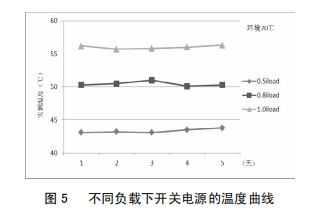 改良后,為考證改良效果,對開關電源分別在0.5倍、0.8倍及1.0倍負載下停止了為期5天的帶負荷實驗,圖5為不同負載下開關電源的溫度曲線,由圖5可知,隨著負荷的增大,開關電源問題總體呈上升趨向;負載不變的狀況下,同一溫度曲線根本堅持平滑;開關電源在額定負載下運轉,最高溫度不超越57℃,未達報警值,開關電源牢靠性得到顯著進步。