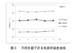 改善后,為考證改善作用,對(duì)開(kāi)關(guān)電源分別在0.5倍、0.8倍及1.0倍負(fù)載下間斷了為期5天的帶負(fù)荷實(shí)驗(yàn),圖5為不同負(fù)載下開(kāi)關(guān)電源的溫度曲線,由圖5可知,跟著負(fù)荷的增大,開(kāi)關(guān)電源問(wèn)題整體呈上升趨向;負(fù)載不變的情況下,同一溫度曲線根柢堅(jiān)持滑潤(rùn);開(kāi)關(guān)電源在額定負(fù)載下作業(yè),最高溫度不超越57℃,未達(dá)報(bào)警值,開(kāi)關(guān)電源牢靠性得到明顯前進(jìn)。