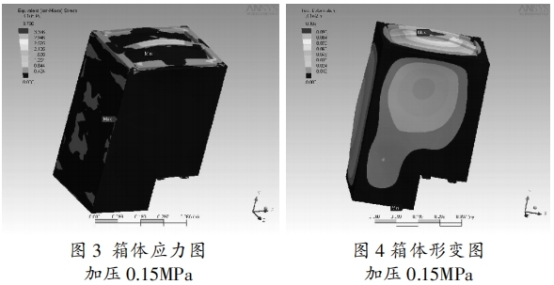 箱壁厚度滿足資料的許應(yīng)應(yīng)力請求及氣箱允許變形量請求。經(jīng)過軟件剖析核算后得到氣箱的應(yīng)力散布(見圖3)及箱體形變(見圖4),終究找到氣箱壁厚。