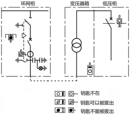 如圖7所示,環(huán)網(wǎng)箱內(nèi)部,隔絕/接地開關(guān)與電纜室門之間的鑰匙聯(lián)鎖,電纜室蓋板翻開后,鑰匙被必定,不能拔出刺進(jìn)到隔絕開關(guān)鎖,即不能操作接地開關(guān);只需蓋板合上,鑰匙才華拔出,去操作接地開關(guān)分閘。而體系角度,只需接地開關(guān)合閘,鑰匙才華被取出,去開變壓器箱的門,結(jié)束變壓器檢修,一起低壓斷路器不能合閘。